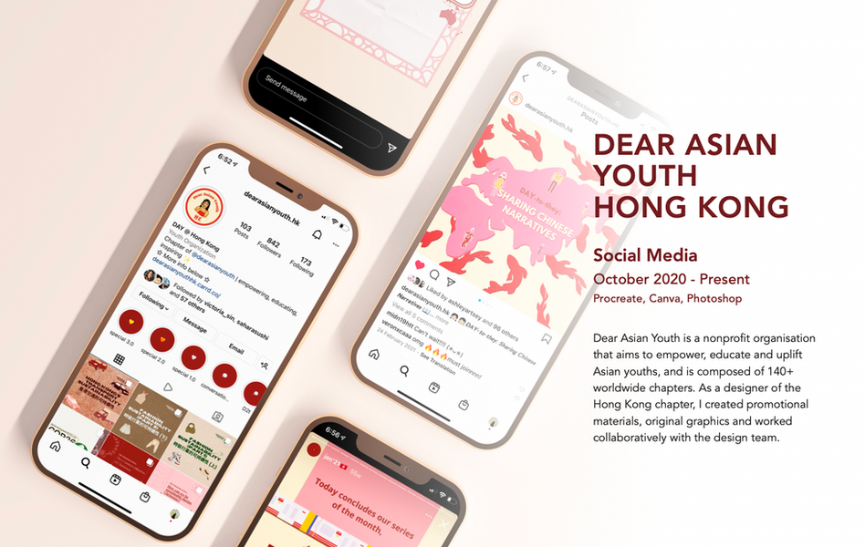 Dear Asian Youth is a nonprofit organisation that aims to empower, educate and uplift Asian youths, and is composed of 140+ worldwide chapters. As a designer of the Hong Kong chapter, I created promotional materials, original graphics and worked collaboratively with the design team.